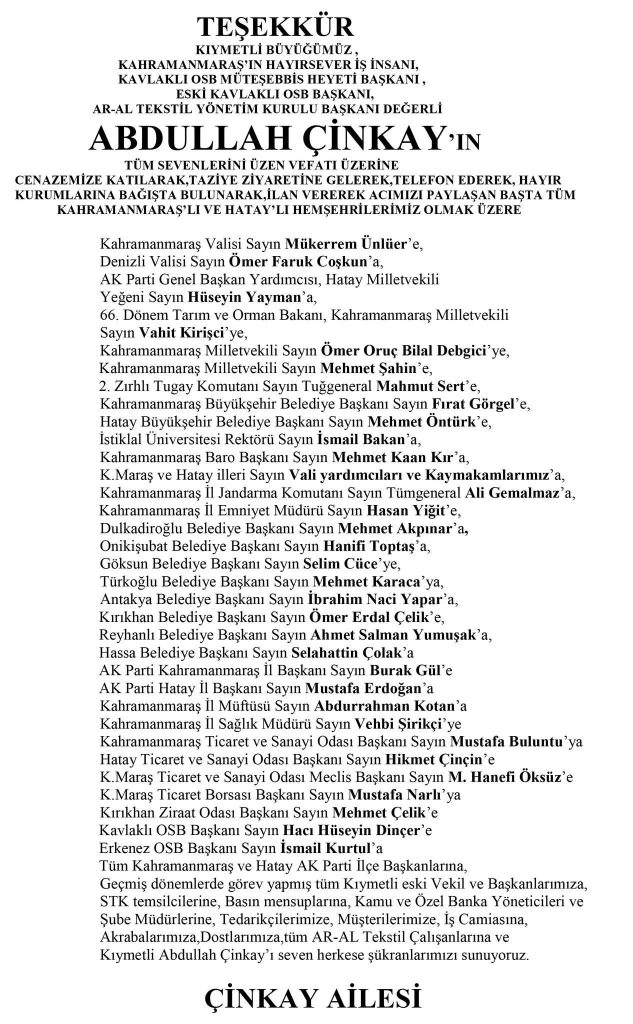 Geçen günlerde Hakk’ın rahmetine kavuşan Kahramanmaraş’ın hayırsever iş insanlarından Kavlaklı OSB müteşebbis heyeti başkanı, Kavlaklı OSB eski başkanı ve AR-AL Tekstil yönetim kurulu başkanı Abdullah Çinkay’ın tüm sevenlerini üzen vefatı üzerine ailesi tarafından teşekkür ilanı yayımlandı.